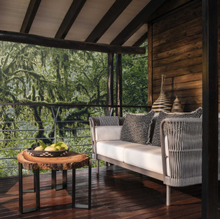 Au cœur de la jungle, la civilisation paraît bien loin et pourtant, en franchissant les portes des chambres, on peine à croire qu’un tel raffinement soit arrivé jusqu’ici : lit à baldaquin habillé de lin beige, tapis ethniques, canapé de velours créent le cadre élégant de cette retraite forestière, encerclée d’une canopée d’arbres.
